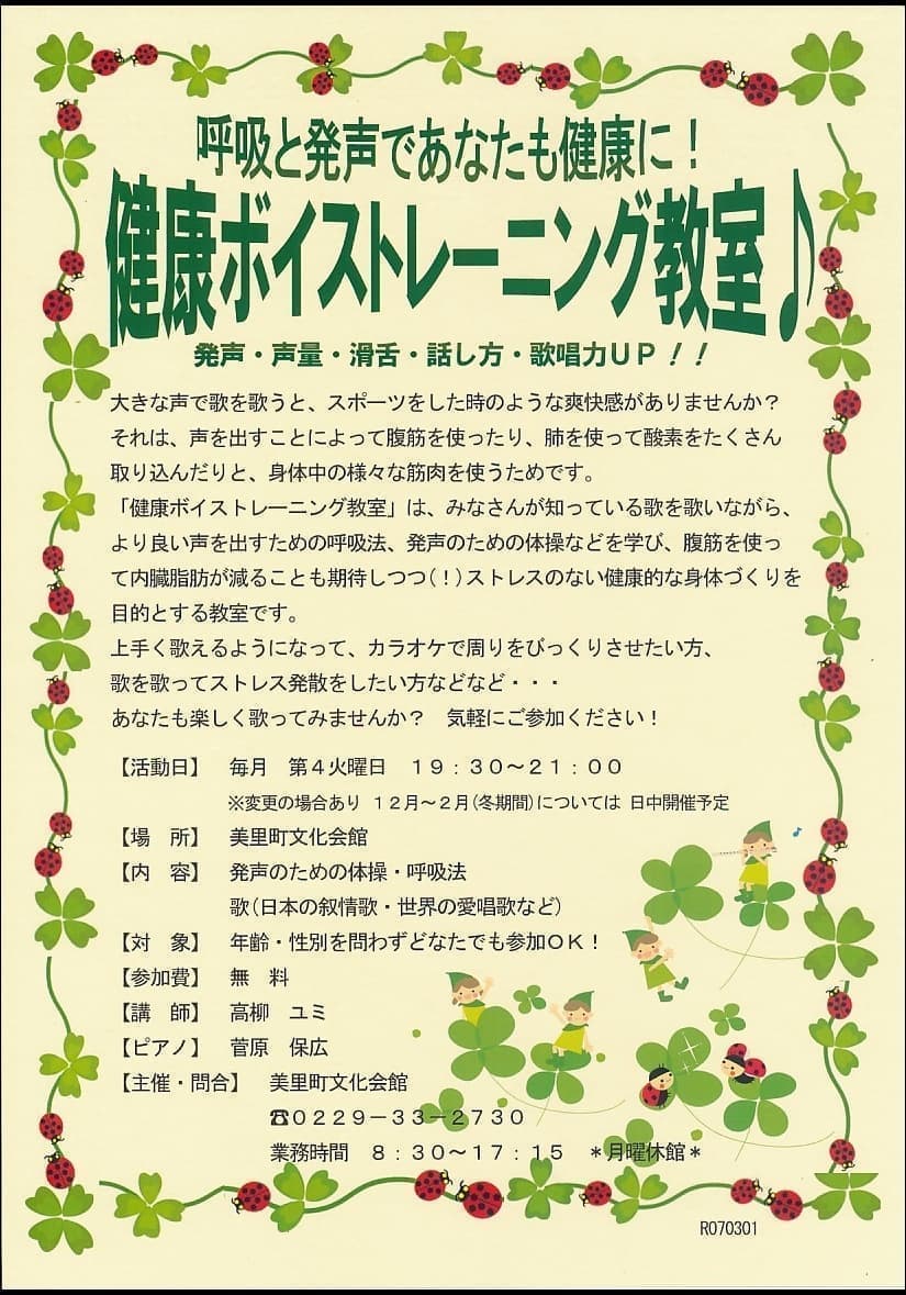 美里町文化会館友の会 美里町文化会館友の会入会・詳細はこちら! sign_2026-01-31-1134.png 兆し kizashi ー音が響き合う音楽祭ー sign_2026-01-24-1001.png 小林幸子コンサート2026 sign_2025-12-24-1510.png 劇団四季ファミリーミュージカル 『はじまりの樹の神話~こそあどの森の物語~』 美里町文化会館 健康ボイストレーニング 健康ボイストレーニング教室