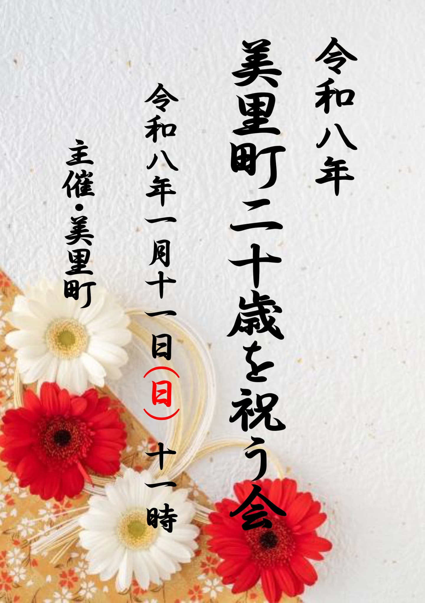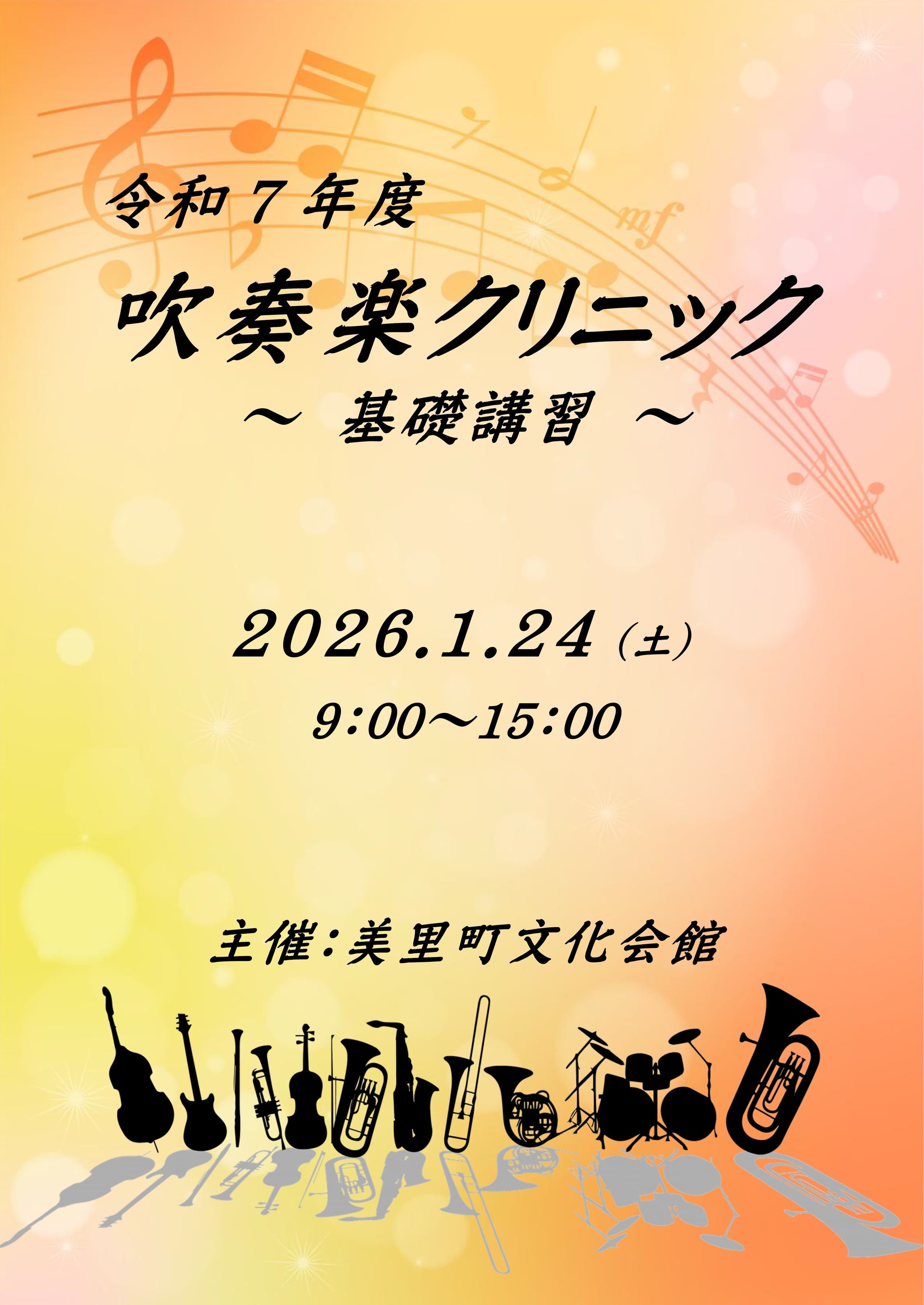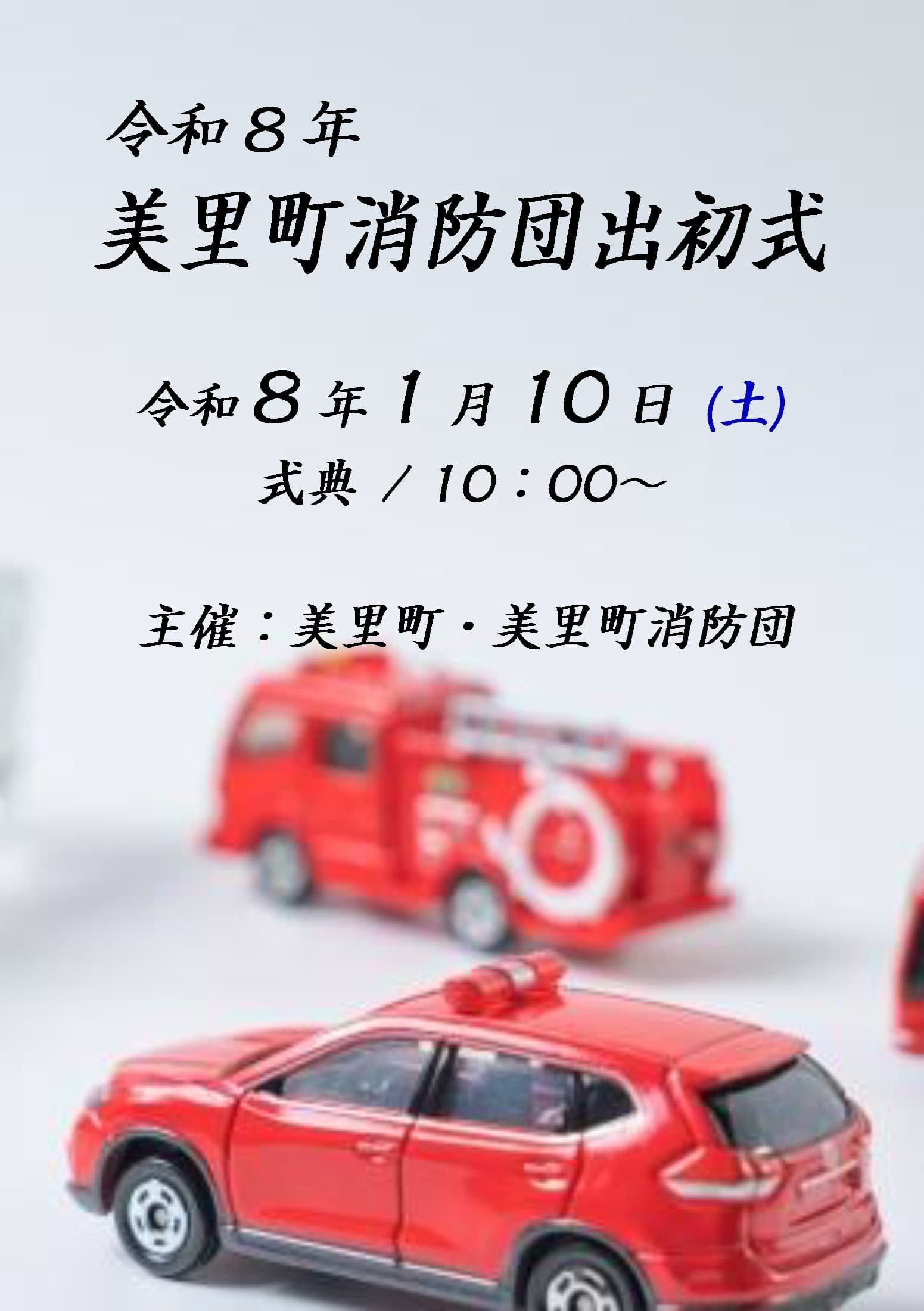 イベント情報 EVENT 令和8年 美里町消防団出初式 2026年1月10日(土)【開式】10:00【入場】無料【主催】美里町/防災管財課【問合】℡ 0229-33-2142 令和8年 美里町二十歳を祝う会 2026年1月11日(日)【開会】11:00【入場】無料【主催】美里町/まちづくり推進課【問合】℡ 0229-33-2180 令和7年度 吹奏楽クリニック-基礎講習- 2026年1月24日(土)【受付】8:50【開始】9:00(~15:30終了予定)【会場】美里町文化会館 美里町近代文学館【聴講】無料【主催】美里町文化会館【問合】TEL 0229-33-2730 健康ボイストレーニング教室(1月教室) 2026年1月25日(日) ※開催日時注意 ※冬期間につき日中開催となります 年齢・性別等参加条件不問。申込不要。 初めての方、見学もできます。 どなたでも参加OK!気軽にお越しください。【場所】美里町文化会館内【時間】13:30【料金】無料【主催】美里町文化会館 【問合】℡ 0229-33-2730詳細はこちら